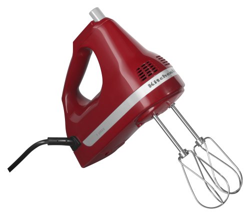 The KitchenAid 7-speed hand mixer is equipped with a powerful yet quiet motor, this lightweight five-speed hand mixer features turbo-powered beaters and an electronic mixing sensor to efficiently whip cream, mix cake batters, beat eggs, and more. The unit's well-balanced ergonomic design eases mixing fatigue, and its handle is angled to minimize wrist strain. Other highlights include an oversized beater-ejector button, a rounded power cord, protected air vents, and a stable heel rest. The 7-speed kitchenaid hand mixer includes high quality stainless steel turbo beaters with a Hassel Free 6 month replacement warranty.
